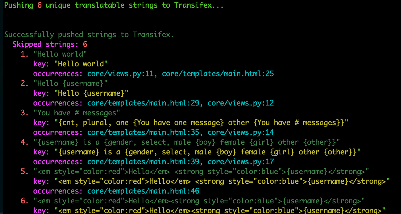 After the strings have been marked either inside templates or in Python code (for example in Views), you can push them to Transifex.
